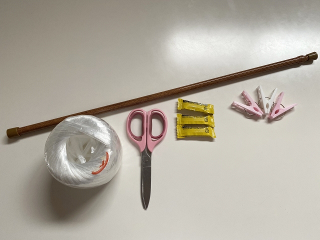 ひもの反対側をつっぱり棒に結び付けます。両端と中央など、間隔をあけて並べると取りやすいです。