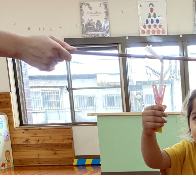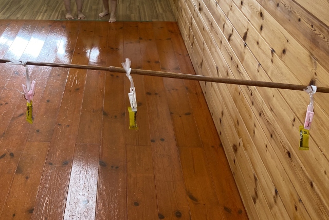 つっぱり棒にお菓子をぶら下げるだけで、盛り上がる「おかし取りゲーム」ができます。