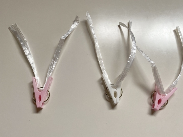 洗濯ばさみのバネ付近にひもを通し、固結びでしっかり固定します。