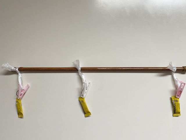 • (代用アイデア)ピンチハンガーや、新聞紙を丸めた棒