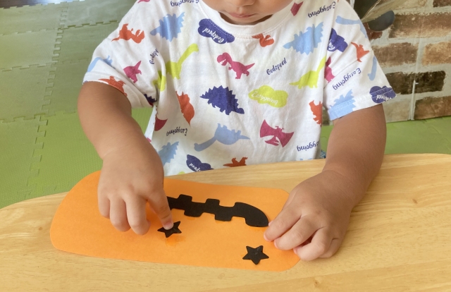 - 0〜1歳:顔パーツを渡して、ペタペタ貼ってみよう!貼るだけでもハロウィン気分が味わえます。
