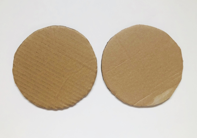 ダンボールを同じ大きさの円に2枚切り抜き、のりで貼り合わせます。